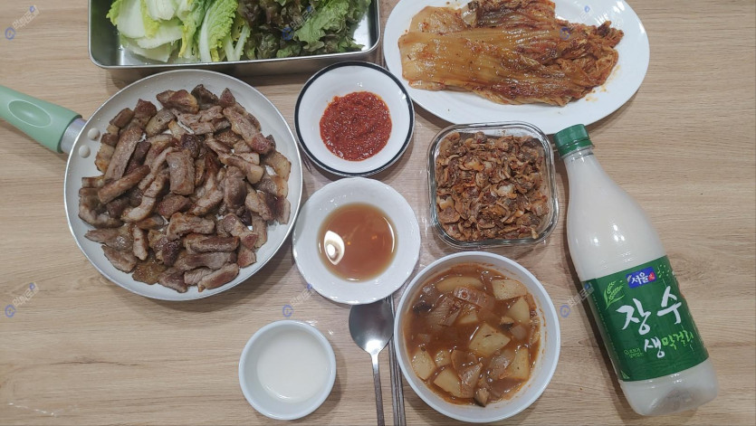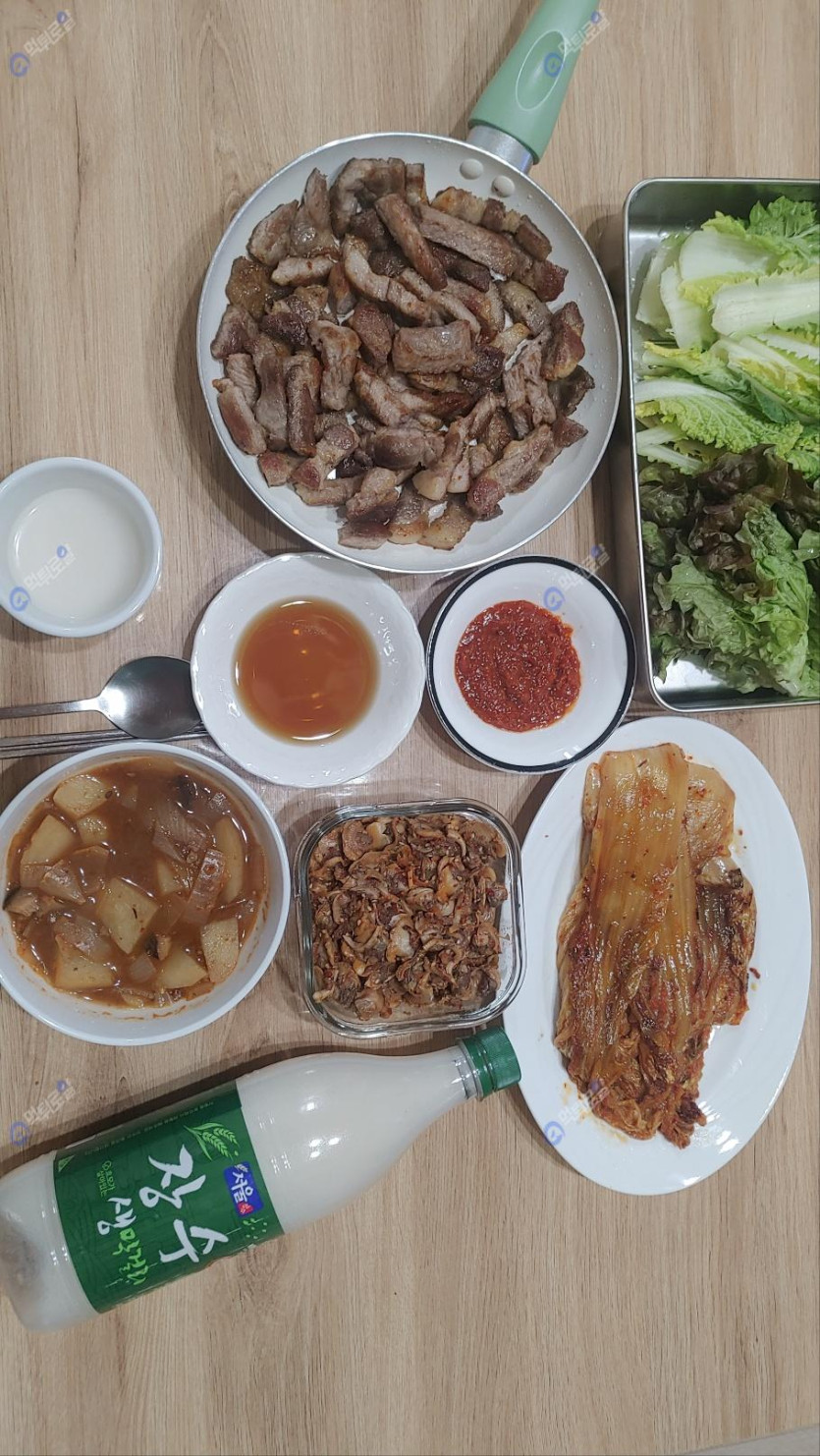 목살구이 봄동 상추 김치구이 꼬막무침 된장찌개 쌈장 참소스...
