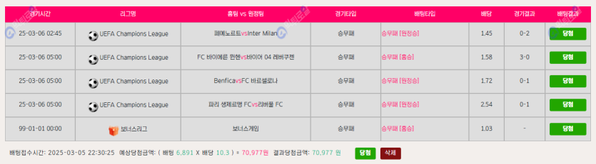 베팅내역 )) 챔스 올킬 ~~ 금액이 아쉽네요..