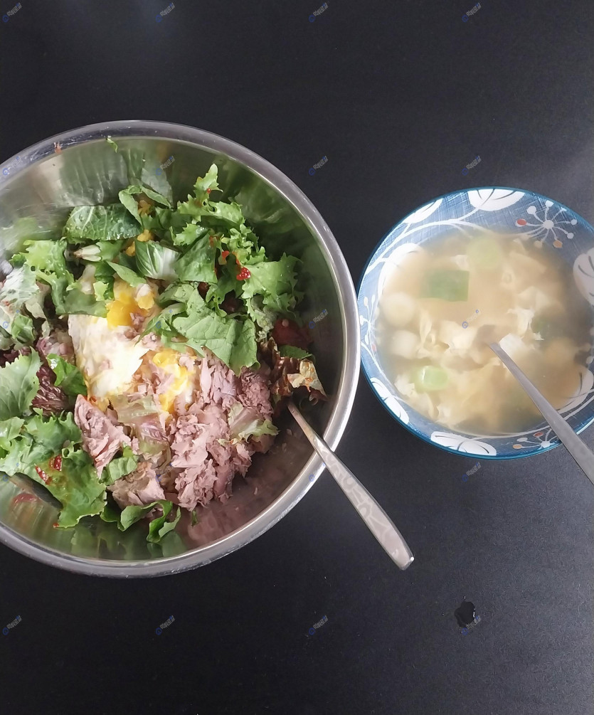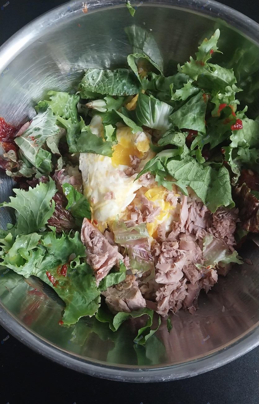계란 두개,참치 한캔 넣고 상추 좀 몇장 찢어 넣어서