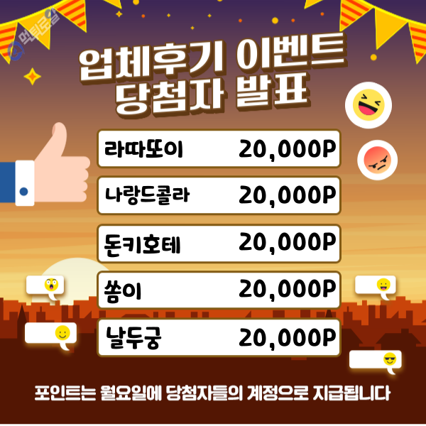 와 ㅠㅠㅠ 거의 업체후기랑 식사이벤트는 4주 연속인 거 같은데요? 진짜 너무 행복합니다 이러니 먹로 활동을 열심히 안할 수가 있겠냐구요ㅠ 오늘까지 푹 쉬고 낼부터 홧팅합시다!!!
