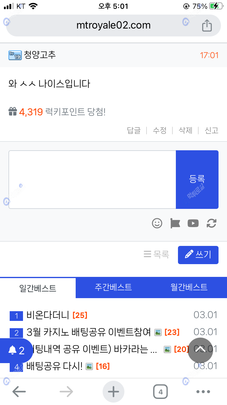 이러다 럭포로 만원 찍겠는데요? 작성자 정보 청양고추 작성 작성일 2025.03.02 17:02 컨텐츠 정보 567 조회 30 댓글 목록 본문 잘떠서 너무 좋네요 ㅎㅎ 0 추천 신고 관련자료 댓글 30 나룻배님의 댓글 나룻배 작성일 2025.03.02 17:03 와 축하드려요 운이 좋으시다 ㅎ 신고 와 축하드려요 운이 좋으시다 ㅎ 청양고추님의 댓글의 댓글 청양고추 작성일 2025.03.02 17:05 운이 아주 좋아용 신고 운이 아주 좋아용 돈키호테님의 댓글 돈키호테 작성일 2025.03.02 17:06 댓글 열심히 다시면 하루에 5~6번 뜨더라구요 ㅎㅎ 신고 댓글 열심히 다시면 하루에 5~6번 뜨더라구요 ㅎㅎ 청양고추님의 댓글의 댓글 청양고추 작성일 2025.03.02 17:08 오옹 은근 많이 뜨네용 신고 오옹 은근 많이 뜨네용 돈키호테님의 댓글 돈키호테 작성일 2025.03.02 17:08 곧 20레벨 되시는데 레벨업 이벤트도 챙기세요 ㅎ 신고 곧 20레벨 되시는데 레벨업 이벤트도 챙기세요 ㅎ 청양고추님의 댓글의 댓글 청양고추 작성일 2025.03.02 17:19 오옹 챙겨야죵 하핳 신고 오옹 챙겨야죵 하핳 창바요님의 댓글 창바요 작성일 2025.03.02 17:08 운 너무 좋으신데요 ?? 신고 운 너무 좋으신데요 ?? 청양고추님의 댓글의 댓글 청양고추 작성일 2025.03.02 17:19 운이 따라두네요 ㅎㅎ 신고 운이 따라두네요 ㅎㅎ 꾸까님의 댓글 꾸까 작성일 2025.03.02 17:24 운이 좋으시네료 !! 신고 운이 좋으시네료 !! 청양고추님의 댓글의 댓글 청양고추 작성일 2025.03.02 17:28 너무 좋아따요 ㅎㅎ 신고 너무 좋아따요 ㅎㅎ 성남은후님의 댓글 성남은후 작성일 2025.03.02 17:29 그렇죠 신고 그렇죠 청양고추님의 댓글의 댓글 청양고추 작성일 2025.03.02 17:31 ㅎㅎㅎ 찍어보죻ㅎ 신고 ㅎㅎㅎ 찍어보죻ㅎ 길거리님의 댓글 길거리 작성일 2025.03.02 17:34 신의아들ㄷㄷ 신고 신의아들ㄷㄷ 청양고추님의 댓글의 댓글 청양고추 작성일 2025.03.02 18:03 아주 좋습니다 ㅎ 신고 아주 좋습니다 ㅎ 황제펭귄님의 댓글 황제펭귄 작성일 2025.03.02 18:12 축하드려요 신고 축하드려요 청양고추님의 댓글의 댓글 청양고추 작성일 2025.03.02 18:15 감사합니당 신고 감사합니당 쿠쿠케케님의 댓글 쿠쿠케케 작성일 2025.03.02 18:43 축하합니다!!! 신고 축하합니다!!! 청양고추님의 댓글의 댓글 청양고추 작성일 2025.03.02 20:16 감사합니당 신고 감사합니당 민바오님의 댓글 민바오 작성일 2025.03.02 20:16 축하드려요 신고 축하드려요 청양고추님의 댓글의 댓글 청양고추 작성일 2025.03.02 20:17 감사합니당 신고 감사합니당 망고마미님의 댓글 망고마미 작성일 2025.03.03 04:26 축하드려요 신고 축하드려요 청양고추님의 댓글의 댓글 청양고추 작성일 2025.03.03 12:27 감사드려용 신고 감사드려용 루팡님의 댓글 루팡 작성일 2025.03.03 14:14 전딱한번이던데 ㅜㅜ 신고 전딱한번이던데 ㅜㅜ 청양고추님의 댓글의 댓글 청양고추 작성일 2025.03.04 23:48 헤헿 뜨실거에영 신고 헤헿 뜨실거에영 록리님의 댓글 록리 작성일 2025.03.03 14:33 축하합니다🎉 신고 축하합니다🎉 청양고추님의 댓글의 댓글 청양고추 작성일 2025.03.04 23:48 감사합니당 신고 감사합니당 루로아노님의 댓글 루로아노 작성일 2025.03.03 17:09 추카드려요 신고 추카드려요 청양고추님의 댓글의 댓글 청양고추 작성일 2025.03.04 23:48 감사두려용 신고 감사두려용 불곰빠따님의 댓글 불곰빠따 작성일 2025.03.06 10:55 맛돌이 ㅎㅎ 신고 맛돌이 ㅎㅎ 청양고추님의 댓글의 댓글 청양고추 작성일 2025.05.05 21:11 맛도리에요 증말 신고 맛도리에요 증말 로그인한 회원만 댓글 등록이 가능합니다. 목록