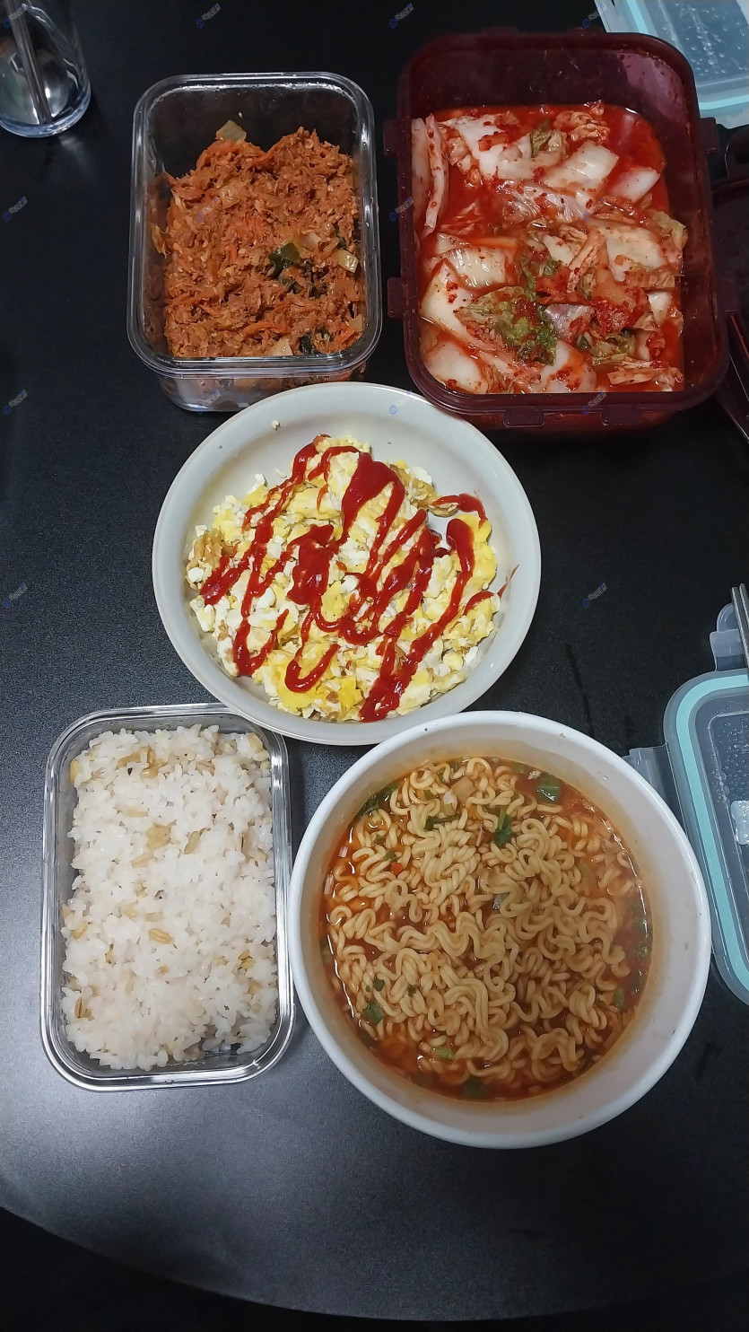오늘 저녁은 컵라면, 계란후라이, 직접 만든 고추참치, 김치, 밥