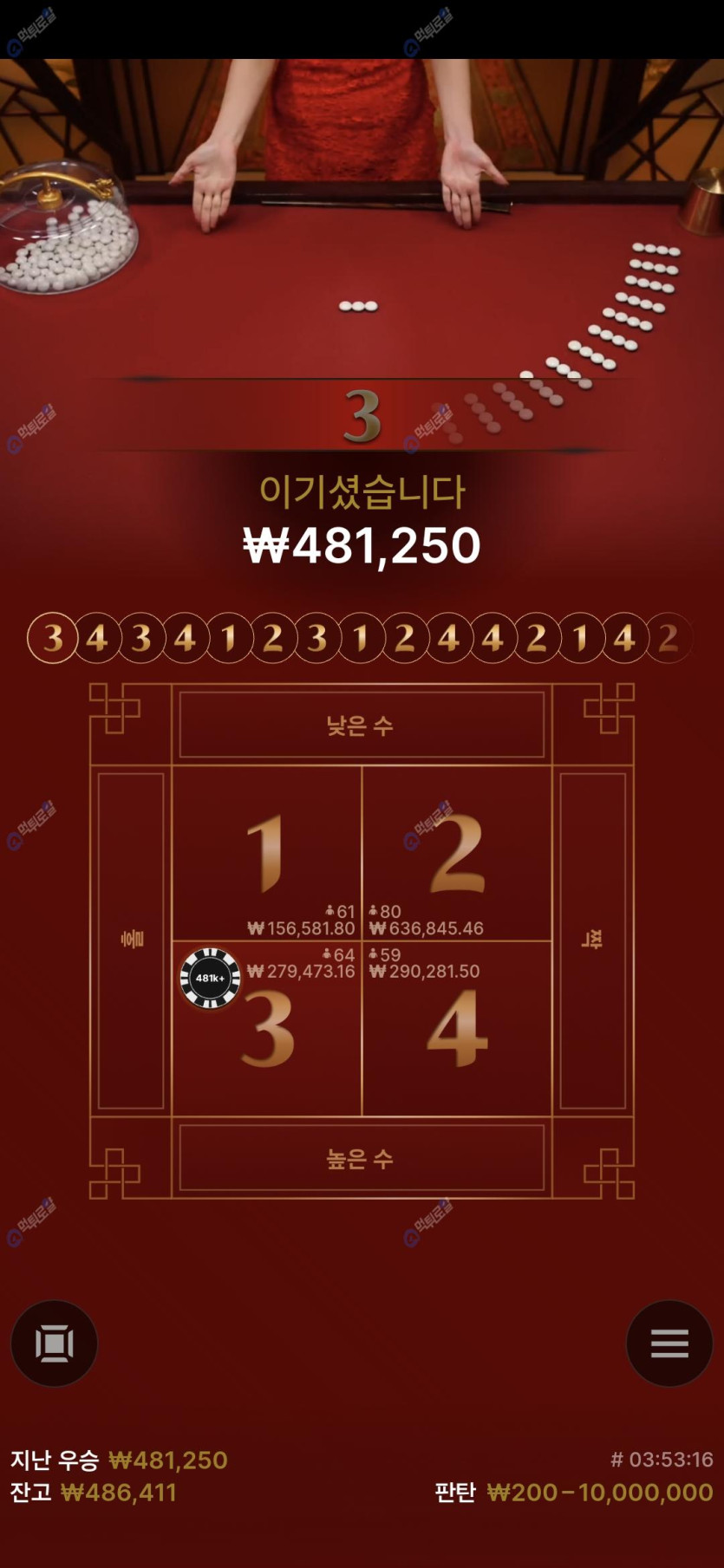 제가 판탄 배팅하다가 3군데에 걸어놨는데 마지막에 뭐 잘못눌러서 4번의 건게 3번에 가서 합쳐진겁니다... 그래서 막 누르다 4번5천원걸고 3번 12만 걸고 스타트... 근데 이게 웬걸 3이나오네욬ㅋㅋㅋㅋㄱ 다시봐도ㄹㅈㄷ