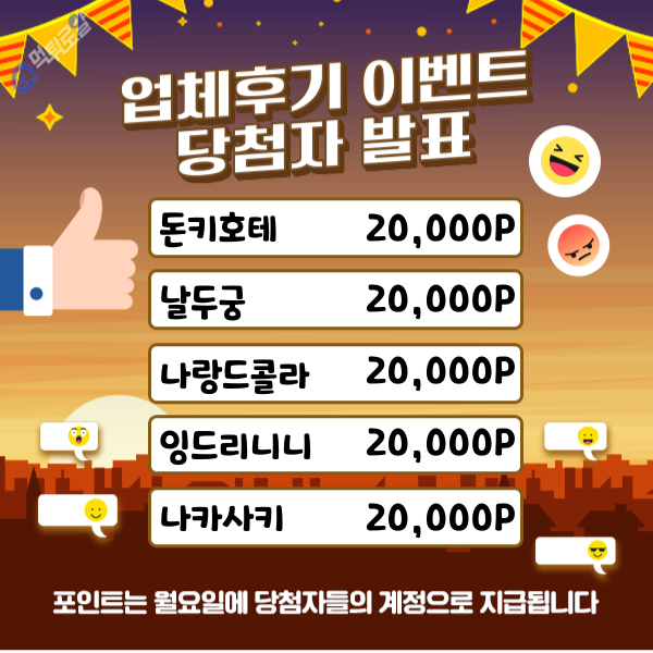 제가 항상 올리는건 식사이벤과 업체 후기인데 그 2개가 계속 당첨되네욧!!!! 오늘도 당첨입니당 거기다 업체후기 이번엔 2만원 당첨이네요ㅎㅎ 먹로 너무사랑합니다