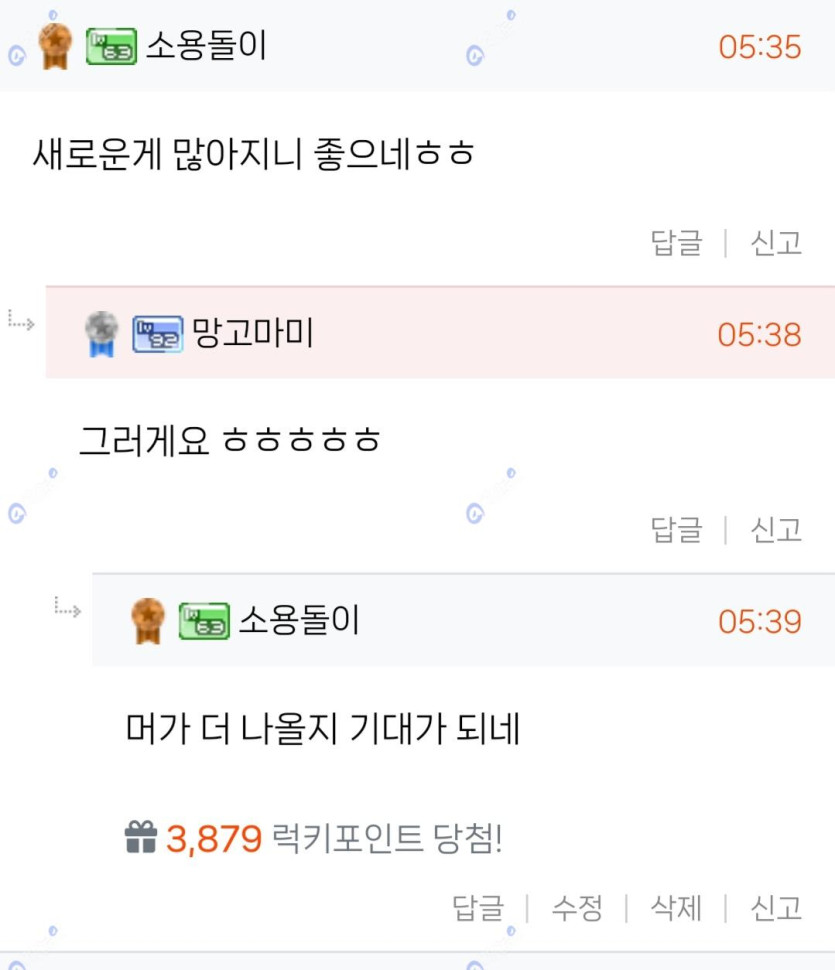소용돌이님의 댓글의 댓글 소용돌이 작성일 2025.02.11 06:00 출첵일어나서 해서 출첵포인트 받은거 마냥 좋으네요!! 신고 출첵일어나서 해서 출첵포인트 받은거 마냥 좋으네요!!