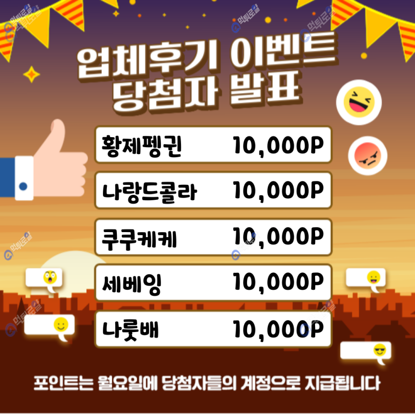 옹 식사이벤트랑 업체후기 2개 당첨 됐네용!! 아주 기분 좋게 하루를 시작할 수 있게 해주셔서 감사합니당! 먹로 활동 더욱 열심히 해야겠네욥!!!