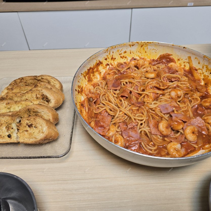 저는 집에 있는 재료로 스파게티에 마늘빵으로