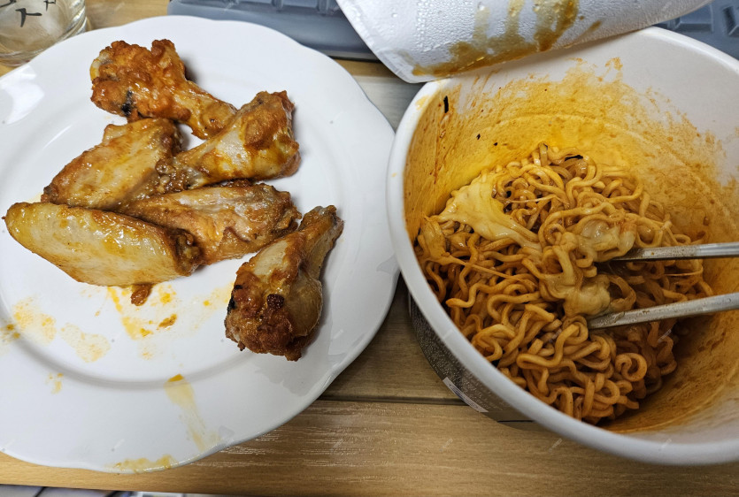 핫윙과 불닭볶음변에 치즈좀 뿌려봤습니다 하남자라ㅎㅎ
