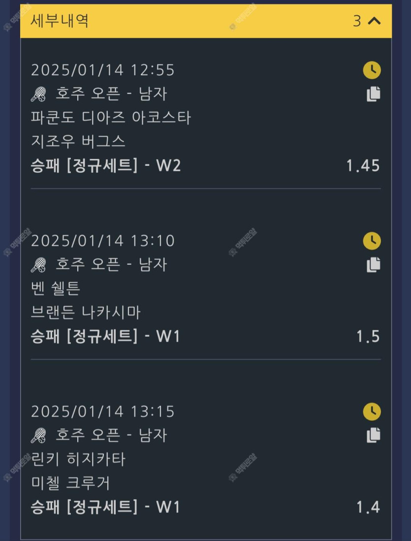 배팅내역 공유이벤트 호주 오픈 테니스 작성자 정보 눈여우 작성 작성일 2025.01.14 12:16 컨텐츠 정보 216 조회 4 댓글 목록 본문 심사숙고해서 배팅했는데 적중기원 ㅠㅠ 0 추천 신고 관련자료 댓글 4 길거리님의 댓글 길거리 작성일 2025.01.14 12:25 적중기원합니다! 신고 적중기원합니다! 나룻배님의 댓글 나룻배 작성일 2025.01.14 14:10 적중가즈아 신고 적중가즈아 쿠쿠케케님의 댓글 쿠쿠케케 작성일 2025.01.14 14:41 적중하셨으려나ㅠㅠ 신고 적중하셨으려나ㅠㅠ 망고마미님의 댓글 망고마미 작성일 2025.01.20 08:04 적중가즈앙 신고 적중가즈앙 로그인한 회원만 댓글 등록이 가능합니다. 목록