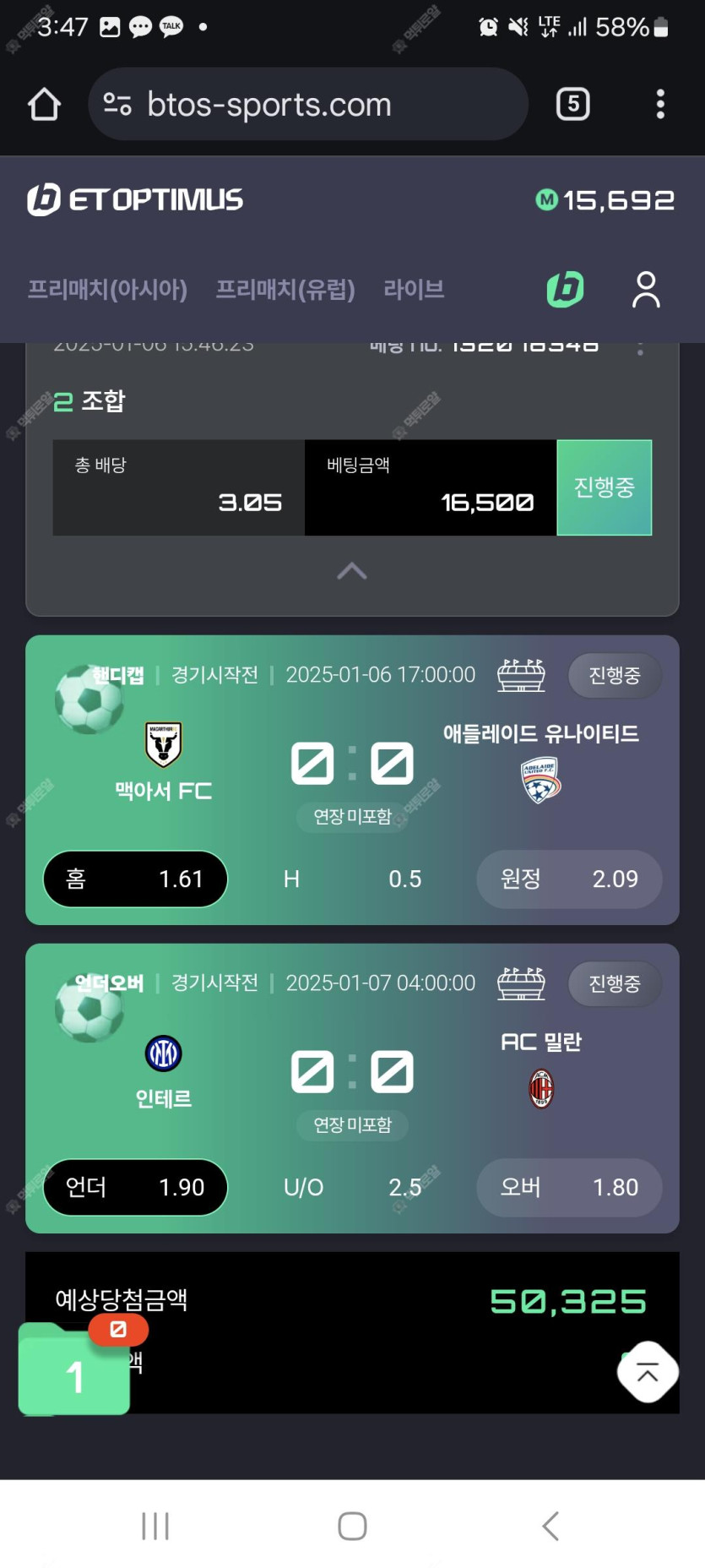 ×배팅내역공유이벤트× 딱2폴 딸만한거 작성자 정보 장갑차 작성 작성일 2025.01.06 15:49 컨텐츠 정보 207 조회 6 댓글 목록 본문 고민끝에 무난하게 들어올것같은거 2개로만 배팅해봤습니다 ㅎㅎ 0 추천 신고 관련자료 댓글 6 나룻배님의 댓글 나룻배 작성일 2025.01.06 16:00 적중가즈아 신고 적중가즈아 장갑차님의 댓글의 댓글 장갑차 작성일 2025.01.06 16:04 나룻배님 화이팅이요 ㅎㅎ 신고 나룻배님 화이팅이요 ㅎㅎ 에어라인님의 댓글 에어라인 작성일 2025.01.06 16:19 건승하세요! 신고 건승하세요! 장갑차님의 댓글의 댓글 장갑차 작성일 2025.01.06 16:20 에어라인님도 건승핫세요 ㅎㅎ다이아시네 ㄷㄷ 신고 에어라인님도 건승핫세요 ㅎㅎ다이아시네 ㄷㄷ 쿠쿠케케님의 댓글 쿠쿠케케 작성일 2025.01.06 16:43 오 맥아서 좋쥬 오버도 좋을 거 같네요 적중기원! 신고 오 맥아서 좋쥬 오버도 좋을 거 같네요 적중기원! 장갑차님의 댓글의 댓글 장갑차 작성일 2025.01.06 17:00 3.5는 쫄리거같아서 ㅠㅠ기준저 신고 3.5는 쫄리거같아서 ㅠㅠ기준저 로그인한 회원만 댓글 등록이 가능합니다. 목록