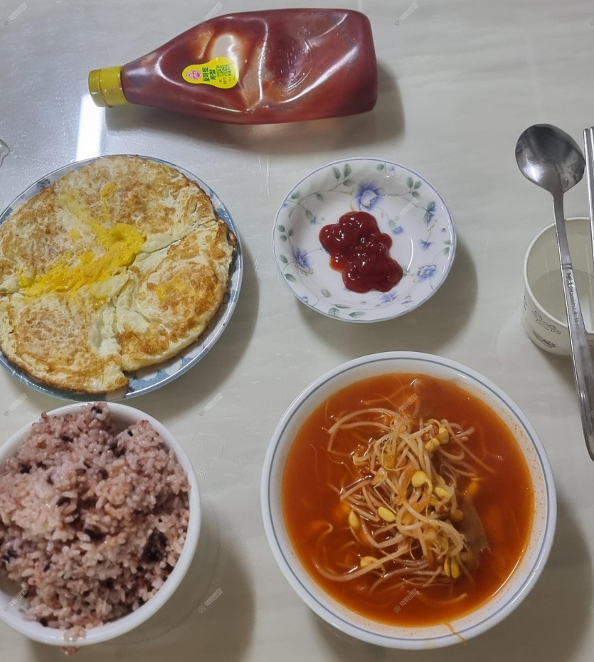 현미밥 김치콩나물국 계란반숙후라이 케찹