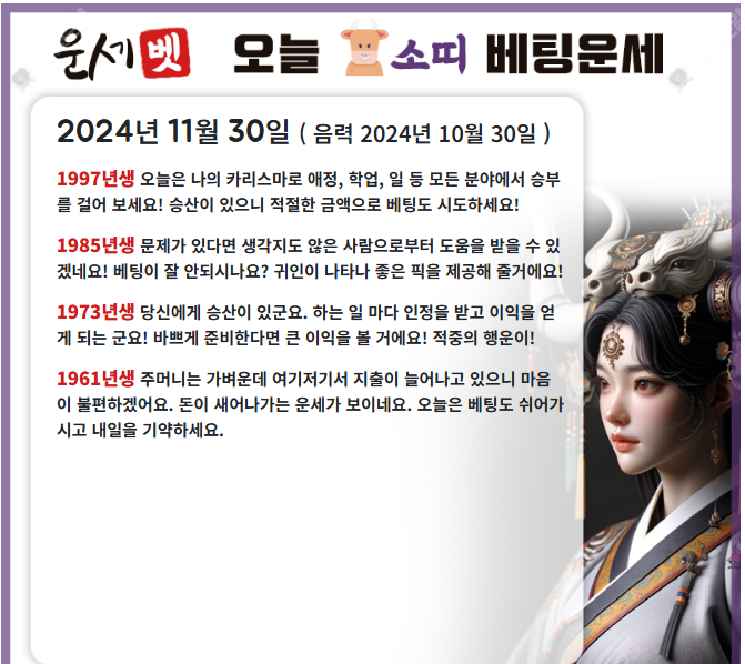 개꿀잼 주말토토 돌아왔다 작성자 정보 운세맨 작성 작성일 2024.11.29 20:31 컨텐츠 정보 227 조회 4 댓글 목록 본문 새축 달릴사람! 운세보고 맞춰가요! 0 추천 신고 관련자료 댓글 4 쿠쿠케케님의 댓글 쿠쿠케케 작성일 2024.11.29 20:33 소띠신가여 신고 소띠신가여 망고마미님의 댓글 망고마미 작성일 2024.11.29 21:22 화이팅ㅎㅎㅎㅎ 신고 화이팅ㅎㅎㅎㅎ 나룻배님의 댓글 나룻배 작성일 2024.11.29 22:00 건승하새요 신고 건승하새요 돈키호테님의 댓글 돈키호테 작성일 2024.11.29 22:10 건승하세요 신고 건승하세요 로그인한 회원만 댓글 등록이 가능합니다. 목록
