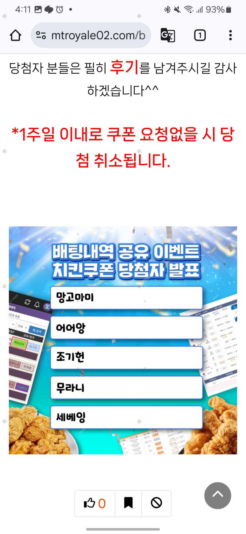 당첨후기 작성자 정보 조기헌 작성 작성일 2024.11.26 16:11 컨텐츠 정보 233 조회 3 댓글 목록 본문 ㄷㄷ 이게 되네요.. 맛있게 먹고 또 올리겠습니다!! 0 추천 신고 관련자료 댓글 3 조기헌님의 댓글 조기헌 작성일 2024.11.26 16:11 야호 신고 야호 망고마미님의 댓글 망고마미 작성일 2024.11.26 17:18 저도있네요 ㅎㅎㅎㅎ 신고 저도있네요 ㅎㅎㅎㅎ 다수표님의 댓글 다수표 작성일 2024.11.26 18:34 축하해요 신고 축하해요 로그인한 회원만 댓글 등록이 가능합니다. 목록