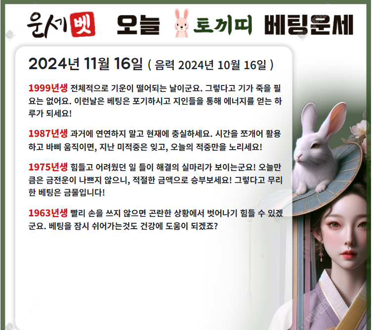 새축 포르투갈 마핸승까지 달려보자!!! 작성자 정보 운세맨 작성 작성일 2024.11.15 22:33 컨텐츠 정보 252 조회 3 댓글 목록 본문 운세보고 조합맞춰갑시다!!! 0 추천 신고 관련자료 댓글 3 푸라닭님의 댓글 푸라닭 작성일 2024.11.15 22:58 건승하시요 신고 건승하시요 망고마미님의 댓글 망고마미 작성일 2024.11.16 05:09 건승ㅎㅎㅎㅎ 신고 건승ㅎㅎㅎㅎ 나룻배님의 댓글 나룻배 작성일 2024.11.16 05:37 건승하새요 신고 건승하새요 로그인한 회원만 댓글 등록이 가능합니다. 목록
