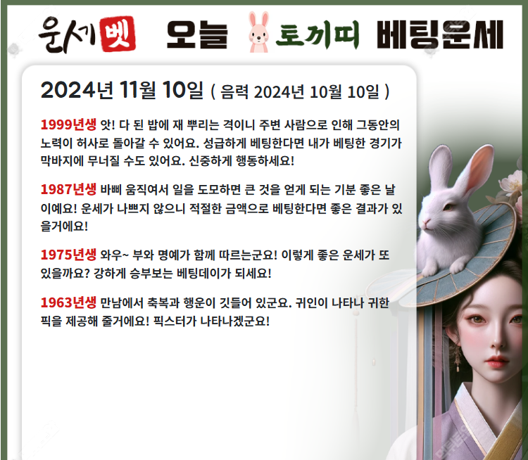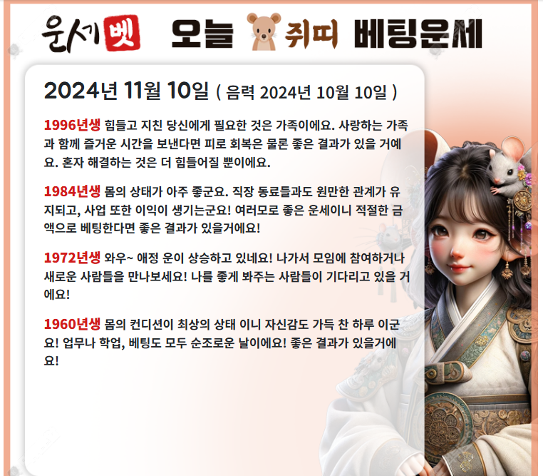 즐거운 주말의 운세 ㅎㅎ 작성자 정보 운세맨 작성 작성일 2024.11.09 23:37 컨텐츠 정보 221 조회 3 댓글 목록 본문 베팅하시는분들 참고하세유~~ 0 추천 신고 관련자료 댓글 3 머니머니님의 댓글 머니머니 작성일 2024.11.09 23:40 좋은 정보 감사해요 신고 좋은 정보 감사해요 프강사님의 댓글 프강사 작성일 2024.11.10 04:38 헐 배팅쉬라는데 미쳐 신고 헐 배팅쉬라는데 미쳐 망고마미님의 댓글 망고마미 작성일 2024.11.10 13:04 화이팅ㅎㅎㅎㅎㅎ 신고 화이팅ㅎㅎㅎㅎㅎ 로그인한 회원만 댓글 등록이 가능합니다. 목록