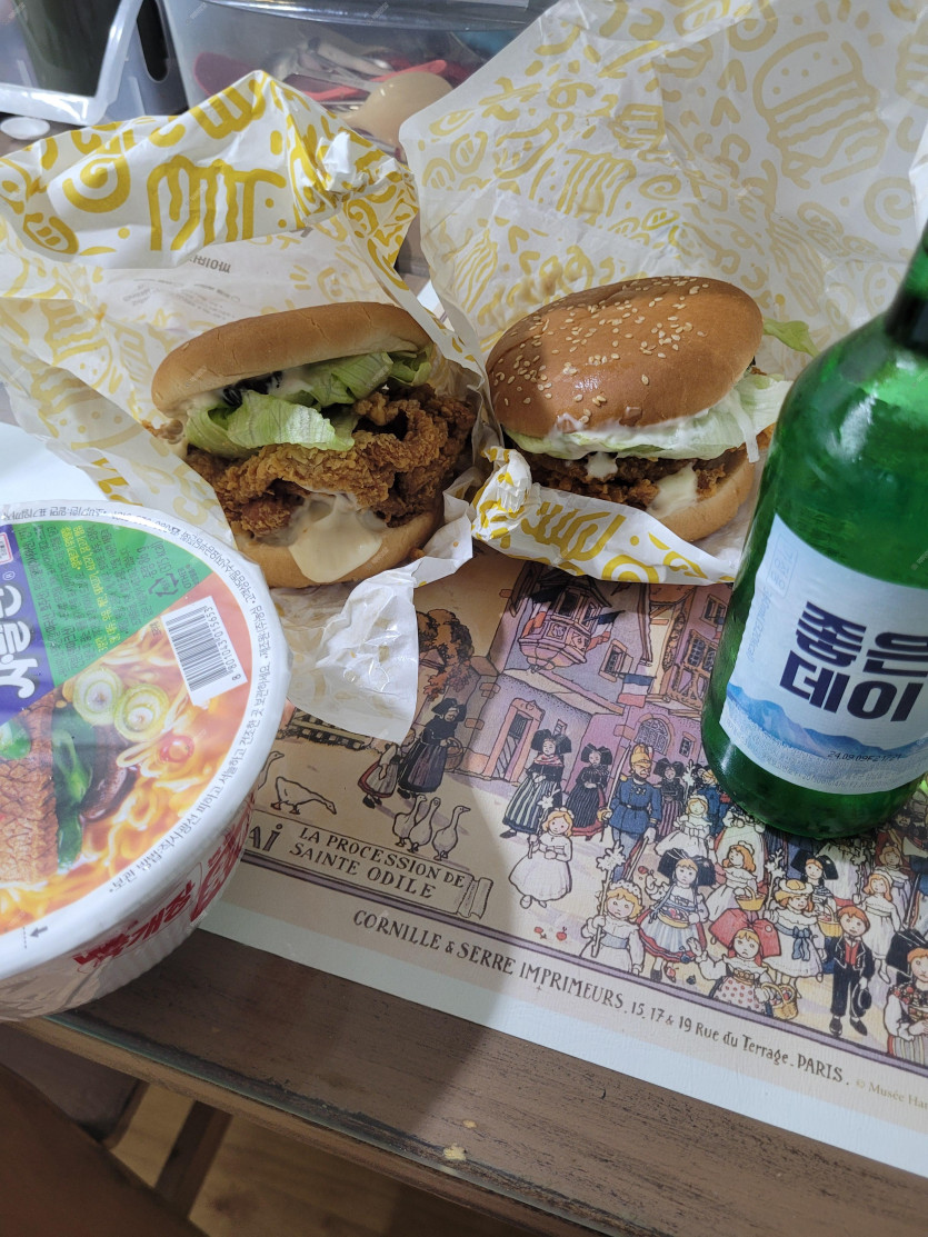 식사이벤)점심 싸이버거 라면에 소주한잔~