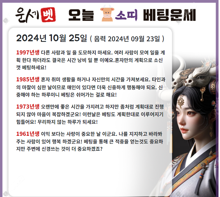 새축 운세보고 강승갈사람~! 작성자 정보 운세맨 작성 작성일 2024.10.24 23:41 컨텐츠 정보 245 조회 3 댓글 목록 본문 운세보고 가면 승률 좋아짐 ㅎㅋ 0 추천 신고 관련자료 댓글 3 악마님의 댓글 악마 작성일 2024.10.24 23:59 감사해요.ㅎ오늘쉬라네요.ㅋㅋ 오늘다같이좋은새벽되요~ㅎ 신고 감사해요.ㅎ오늘쉬라네요.ㅋㅋ 오늘다같이좋은새벽되요~ㅎ 요미치님의 댓글 요미치 작성일 2024.10.25 00:01 파이팅 신고 파이팅 망고마미님의 댓글 망고마미 작성일 2024.10.27 13:50 화이팅ㅎㅎㅎㅎ 신고 화이팅ㅎㅎㅎㅎ 로그인한 회원만 댓글 등록이 가능합니다. 목록