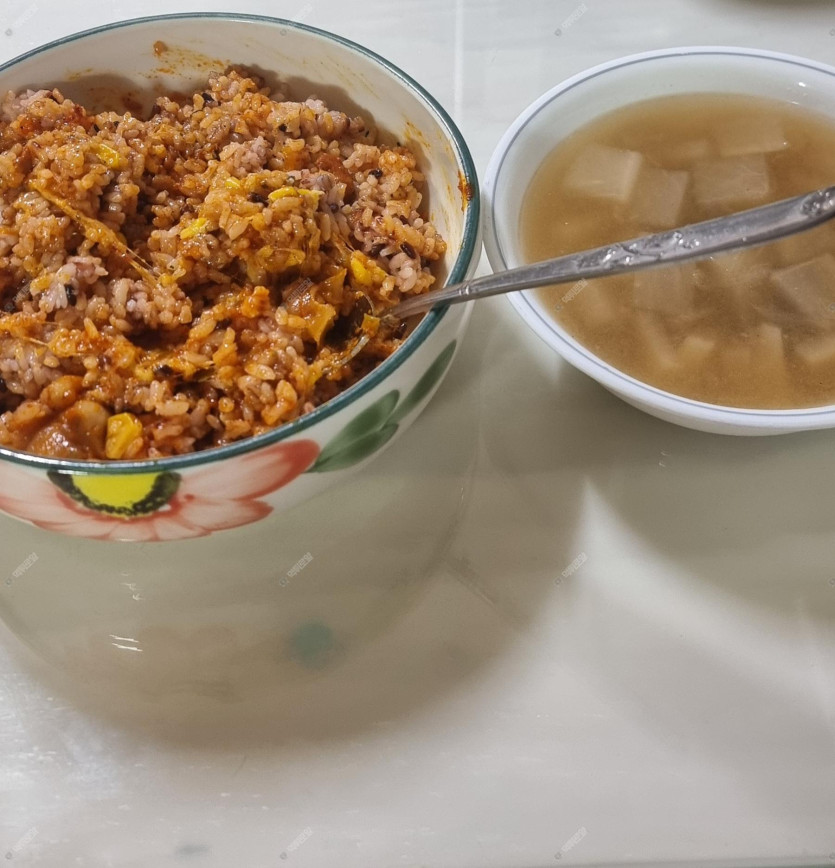 불닭 제육 콘치즈 섞은 비빔밥 & 탕국~