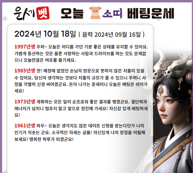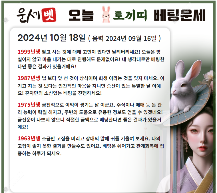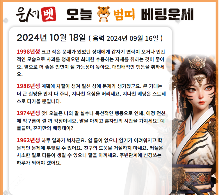 내일오전 다저스 마핸승 달려봅시다~! 작성자 정보 운세맨 작성 작성일 2024.10.17 20:06 컨텐츠 정보 223 조회 1 댓글 목록 본문 운세보고 건승하십쇼!!! 0 추천 신고 관련자료 댓글 1 망고마미님의 댓글 망고마미 작성일 2024.10.17 21:03 화이팅이용 신고 화이팅이용 로그인한 회원만 댓글 등록이 가능합니다. 목록