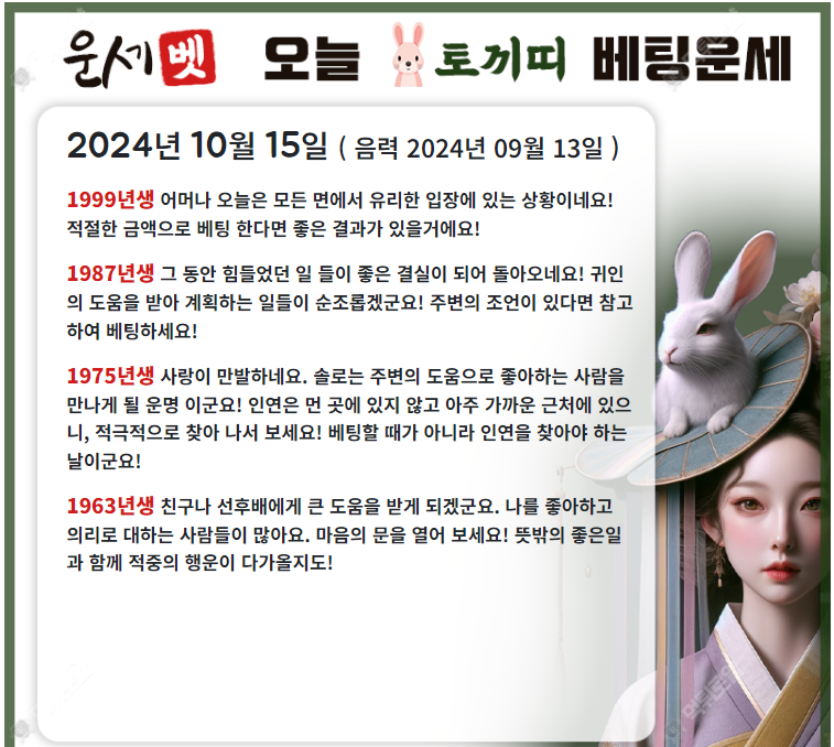 한주 잘 시작 하셨나요?? 작성자 정보 운세맨 작성 작성일 2024.10.14 23:40 컨텐츠 정보 245 조회 1 댓글 목록 본문 운세보고 힘내봅시다!! 0 추천 신고 관련자료 댓글 1 망고마미님의 댓글 망고마미 작성일 2024.10.15 00:06 좋은하루되세용 신고 좋은하루되세용 로그인한 회원만 댓글 등록이 가능합니다. 목록