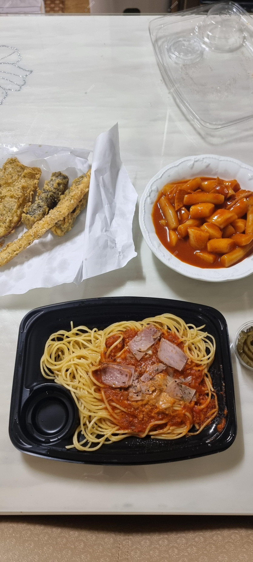 스파게티 쌀떡볶이 김말이튀김 오징어튀김