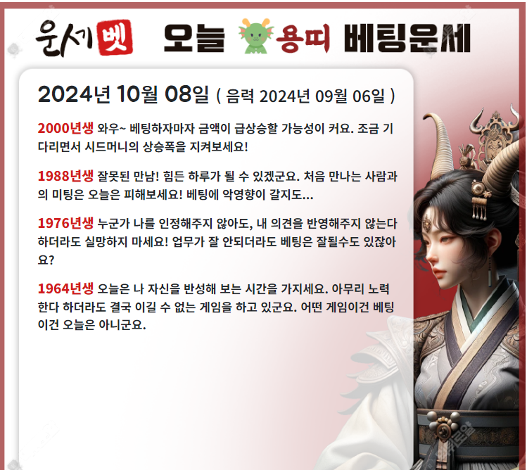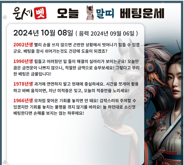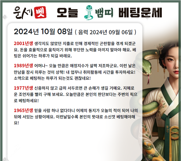 새벽베팅 미리 분석하고 가봅시다~! 작성자 정보 운세맨 작성 작성일 2024.10.07 19:37 컨텐츠 정보 235 조회 5 댓글 목록 본문 오늘도 운세보고 화이팅!! 0 추천 신고 관련자료 댓글 5 쿠쿠케케님의 댓글 쿠쿠케케 작성일 2024.10.07 19:39 감사합니다! 신고 감사합니다! 디카카님의 댓글 디카카 작성일 2024.10.07 19:39 건승입니당 신고 건승입니당 수달님의 댓글 수달 작성일 2024.10.07 21:21 건승하세요 신고 건승하세요 망고마미님의 댓글 망고마미 작성일 2024.10.07 22:08 건승하세용 신고 건승하세용 나룻배님의 댓글 나룻배 작성일 2024.10.08 08:56 건승하새요 신고 건승하새요 로그인한 회원만 댓글 등록이 가능합니다. 목록
