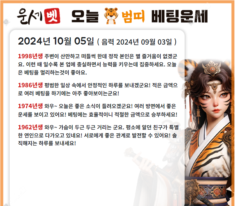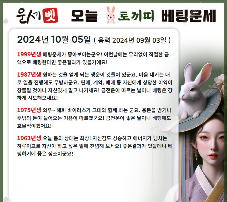 주말 베팅 달려봅시다! 작성자 정보 운세맨 작성 작성일 2024.10.05 19:32 컨텐츠 정보 230 조회 7 댓글 목록 본문 즐거운 주말 맛나게 드세요! 0 추천 신고 관련자료 댓글 7 소용돌이님의 댓글 소용돌이 작성일 2024.10.05 20:07 운세 말띠는 언제나오나요 ㅎㅎㅎ 신고 운세 말띠는 언제나오나요 ㅎㅎㅎ 히든배팅님의 댓글 히든배팅 작성일 2024.10.05 20:19 저도 말띠 운세올려주세요 ㅋㅋㅋㅋㅋㅋ 신고 저도 말띠 운세올려주세요 ㅋㅋㅋㅋㅋㅋ 디카카님의 댓글 디카카 작성일 2024.10.05 20:28 가봅시다ㄷ다당 신고 가봅시다ㄷ다당 조기헌님의 댓글 조기헌 작성일 2024.10.05 20:43 ㄱㄱ 신고 ㄱㄱ 돈키호테님의 댓글 돈키호테 작성일 2024.10.05 21:03 건승하세요 신고 건승하세요 망고마미님의 댓글 망고마미 작성일 2024.10.05 23:32 달리자아아아아 신고 달리자아아아아 나룻배님의 댓글 나룻배 작성일 2024.10.06 06:36 건승하새요 신고 건승하새요 로그인한 회원만 댓글 등록이 가능합니다. 목록
