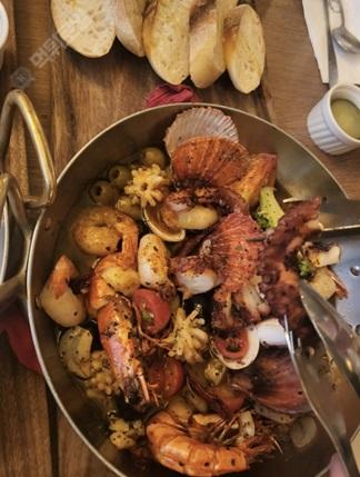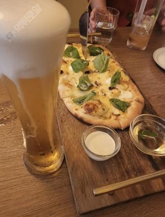 저녁식사로 피자와 해산물 요리에 먹고 있네요~~