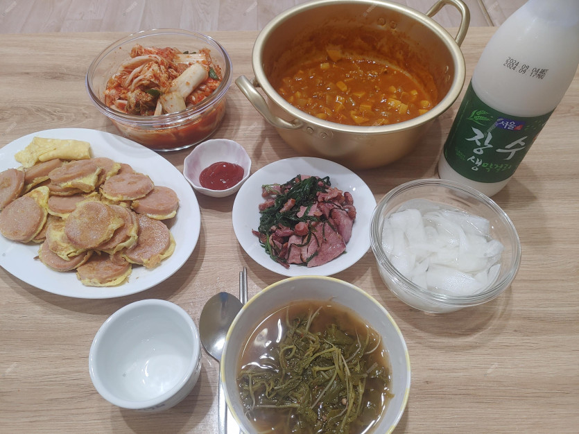 카레+분홍소세지+부추 오리고기+장수막걸리=😋