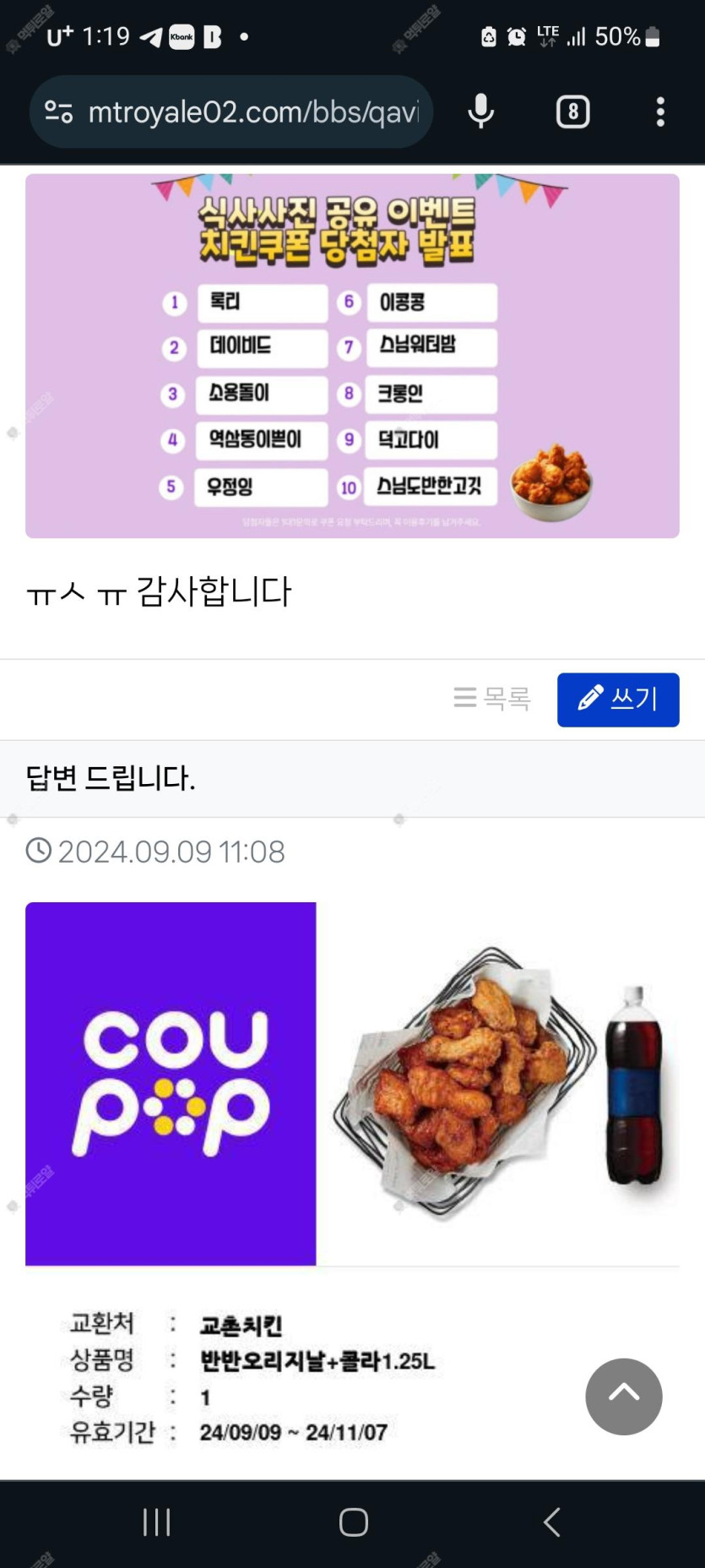 식사이벤트당첨인증 작성자 정보 크롱인 작성 작성일 2024.09.09 13:20 컨텐츠 정보 265 조회 5 댓글 목록 본문 감사히 잘먹겠습니다!! 치킨사진은 배달되면 다시 올릴게요 0 추천 신고 관련자료 댓글 5 소용돌이님의 댓글 소용돌이 작성일 2024.09.09 13:27 당첨 축하드려요! ㅎ 신고 당첨 축하드려요! ㅎ 로이열2님의 댓글 로이열2 작성일 2024.09.09 13:34 축하드려요! 신고 축하드려요! 디카카님의 댓글 디카카 작성일 2024.09.09 14:25 축하드립니당 신고 축하드립니당 스님워터밤님의 댓글 스님워터밤 작성일 2024.09.09 18:32 축하드려용ㅎㅎ 신고 축하드려용ㅎㅎ 망고마미님의 댓글 망고마미 작성일 2024.09.10 02:37 축하드립니당 신고 축하드립니당 로그인한 회원만 댓글 등록이 가능합니다. 목록
