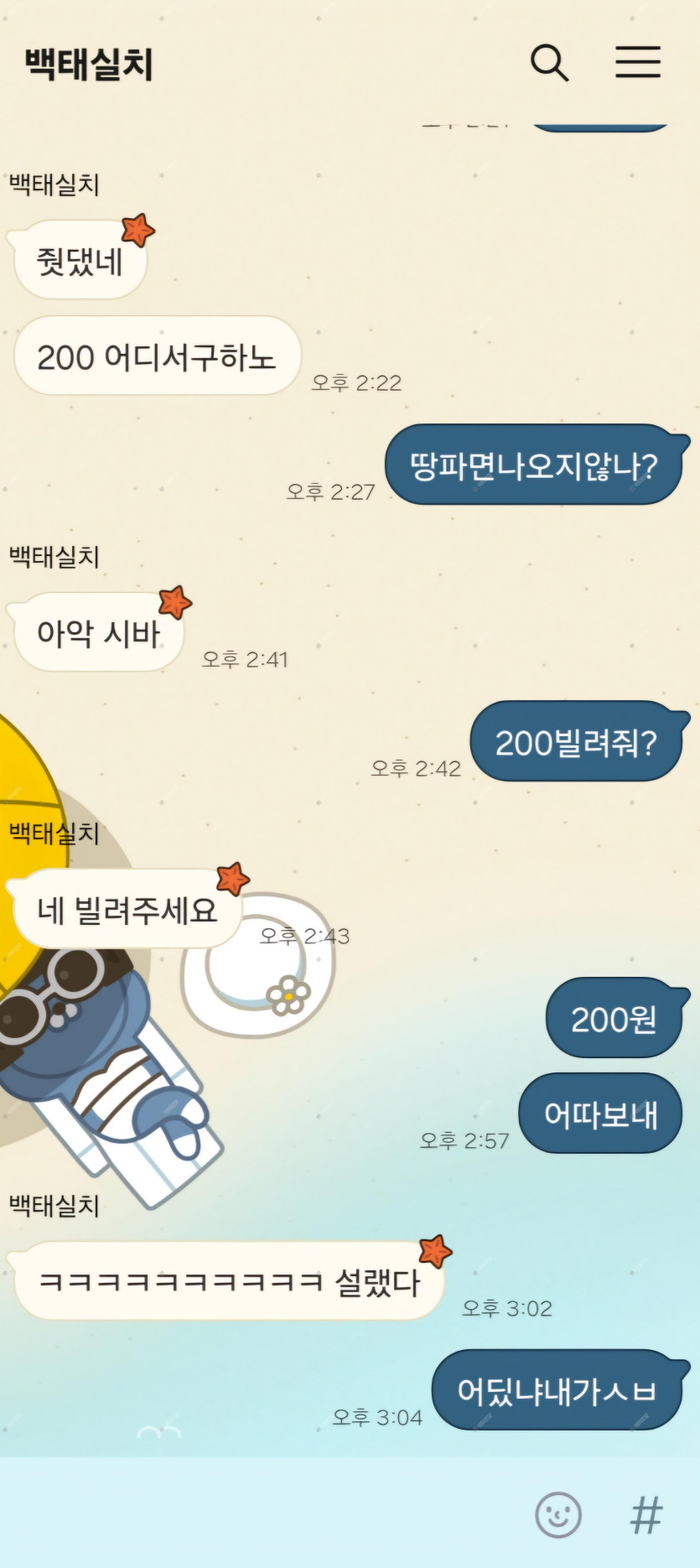 제 친구와 무근본 톡! 작성자 정보 스님워터밤 작성 작성일 2024.09.07 10:51 컨텐츠 정보 249 조회 8 댓글 목록 본문 전 친구들하고 보통 이렇게 쓸데없는 대화를 하는데 웃겨서 올려봅니당ㅎㅎ 참고로 제 친구가 마르고 혀에 백태가 있어서 이름을 백태실치로 했습니당ㅎㅎㅎㅎ 어제 있던 일! 1 추천 신고 관련자료 댓글 8 스님도반한고깃님의 댓글 스님도반한고깃 작성일 2024.09.07 10:52 1억만 보내주십사 신고 1억만 보내주십사 스님워터밤님의 댓글의 댓글 스님워터밤 작성일 2024.09.07 10:53 1원 어디다가 보내! 신고 1원 어디다가 보내! 스님도반한고깃님의 댓글의 댓글 스님도반한고깃 작성일 2024.09.07 10:54 1원이라뇨... 신고 1원이라뇨... 슈퍼써니님의 댓글 슈퍼써니 작성일 2024.09.07 11:05 ㅋㅋㅋ 신고 ㅋㅋㅋ 스님워터밤님의 댓글의 댓글 스님워터밤 작성일 2024.09.07 11:14 웃기죵?ㅋㅋㅋ 신고 웃기죵?ㅋㅋㅋ 디카카님의 댓글 디카카 작성일 2024.09.07 11:07 ㅋㅋㅋㅋㅋ 신고 ㅋㅋㅋㅋㅋ 스님워터밤님의 댓글의 댓글 스님워터밤 작성일 2024.09.07 11:14 정상이없는친구들 신고 정상이없는친구들 덕고다이님의 댓글 덕고다이 작성일 2024.09.07 12:08 ㅋㅋㅋㅋㅋ와우잘보고갑니다 신고 ㅋㅋㅋㅋㅋ와우잘보고갑니다 로그인한 회원만 댓글 등록이 가능합니다. 목록