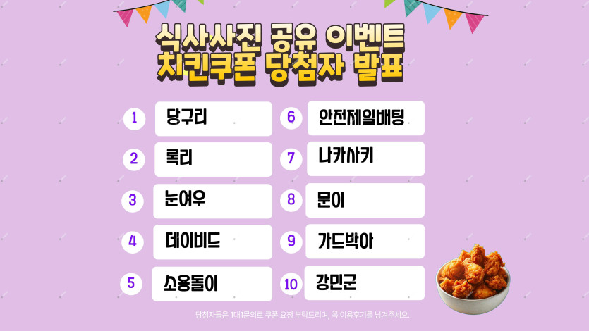 1:1 문의로 치킨쿠폰 요청부탁드립니다.