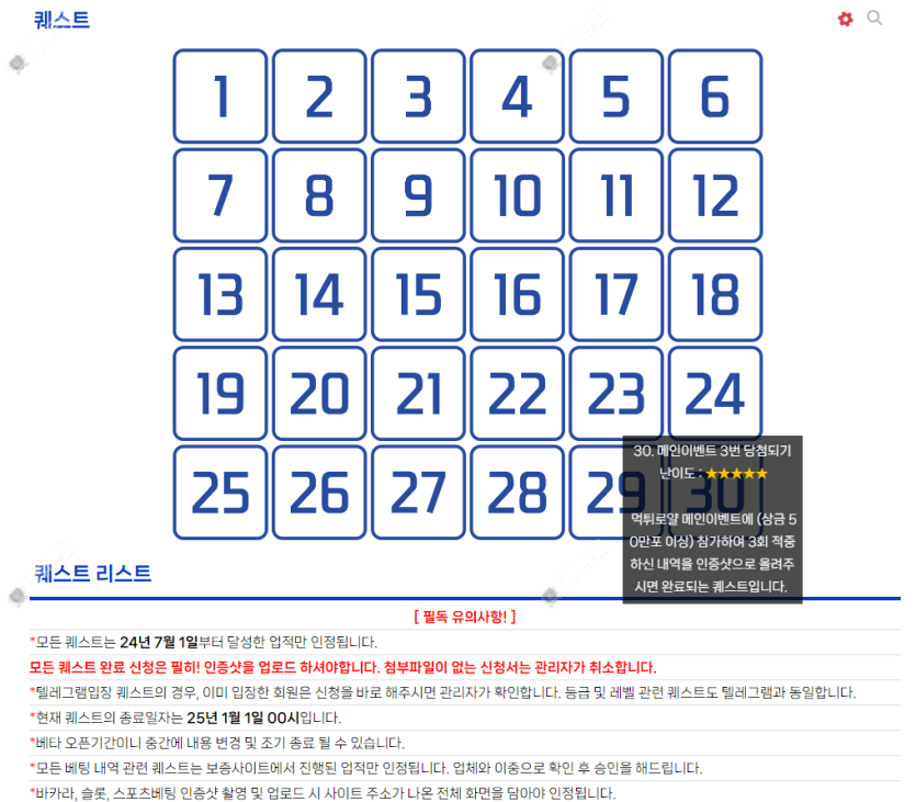 이번 퀘스트 이벤트는 저희 먹튀로얄에서 활동하시는 회원님들께 재미와 보상을 드리기 위해 준비된 특별 이벤트입니다. 이벤트 기간은 올해 말까지로, 아직 충분한 시간이 남아 있으니 포기하지 마시고 많은 회원님이 완료해 주시길 기대하겠습니다.