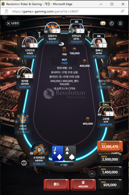 1등 햇으면 좋겠는데 처음 부터 지금까지 칩리더 유지 하면서 왔는데 한번 실수로 반스택이 날아갔지만